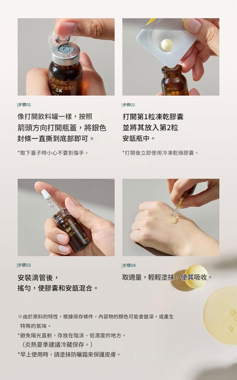 這是一款包含純維他命C粉和活化安瓶 主要用於提亮膚色和抗氧化功效