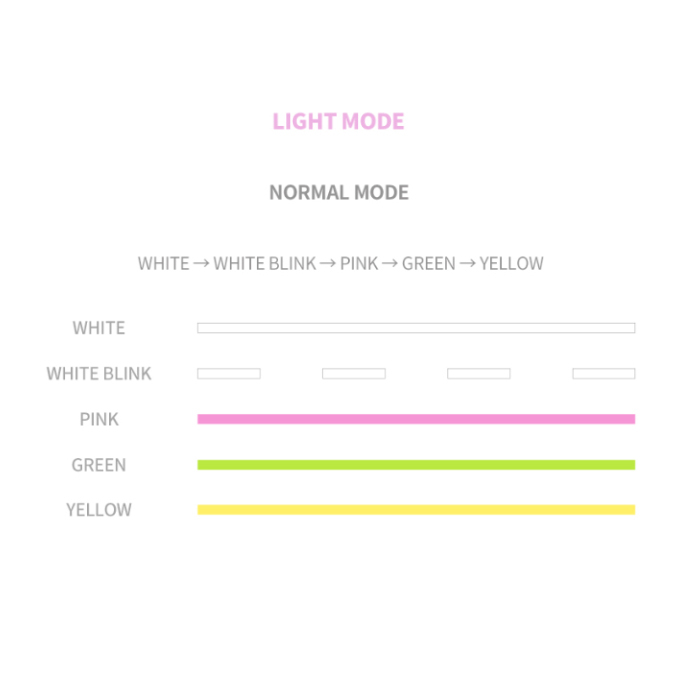 燈光模式:白光 → 白光閃爍 → 粉紅色 → 綠光 → 黃色